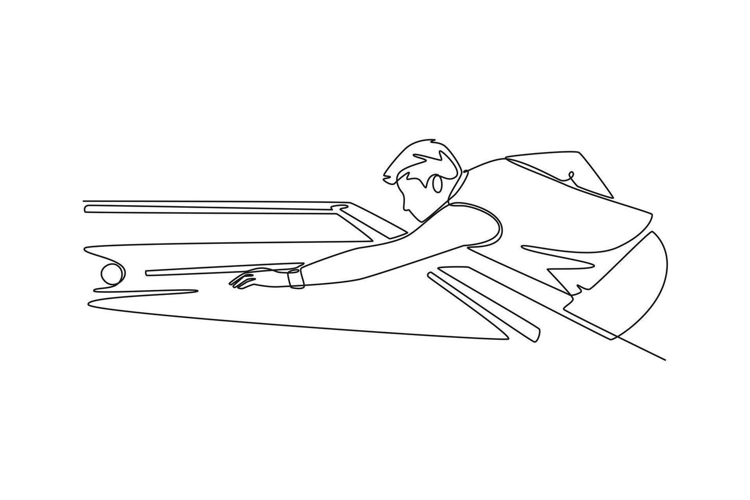 Continuous one line drawing young man making a precise shot in game of billiards, showcasing his intense focus and the dynamic action of the sport. Single line draw design graphic illustration Pro Vector