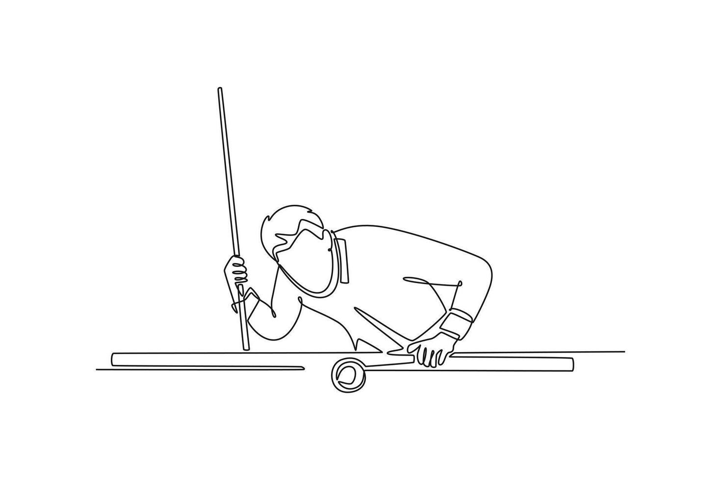 Single one line drawing man playing billiards in low, focused stance, aiming shot on pool table. Precision, strategy, concentration of the game. Continuous line draw design graphic illustration Pro Vector