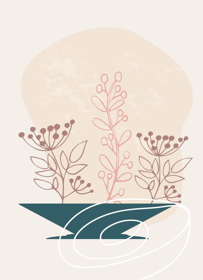 Abstract botanical wall art. Field grass and branch with leaves in a vase or pot on the background of simple geometric shapes. minimalist composition in boho style Pro Vector