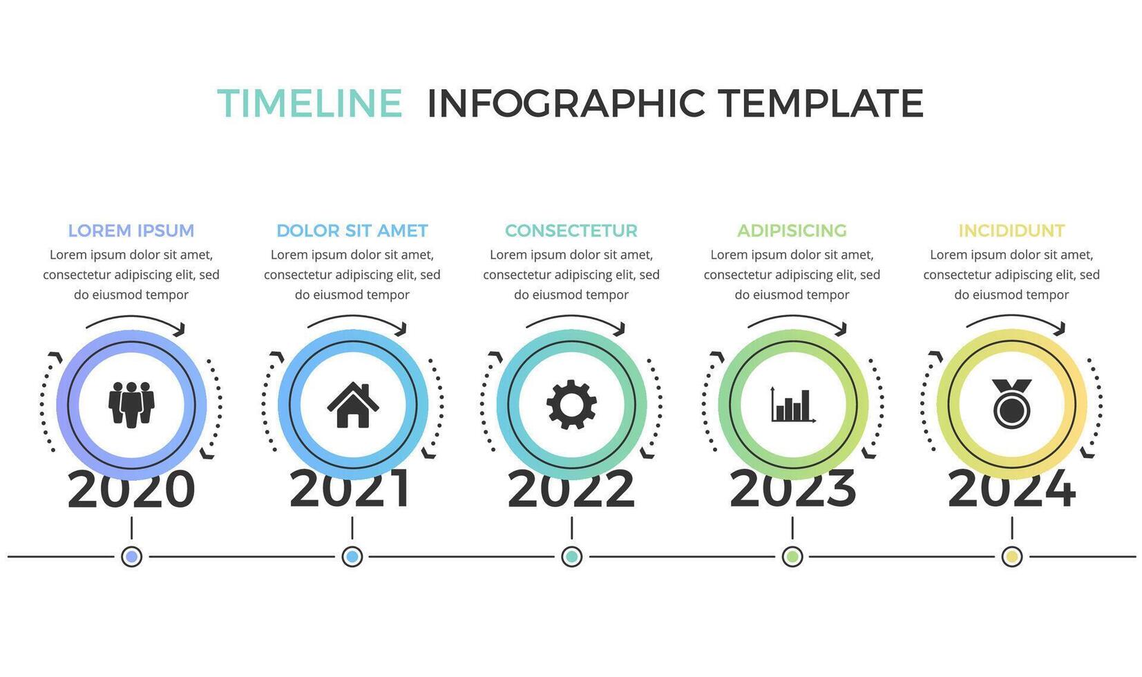 Timeline infographics template with five circles with place for your icons and text Pro Vector
