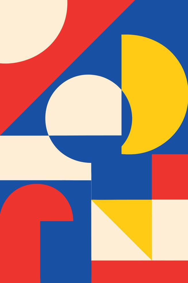 Abstract geometric composition featuring a large yellow circle overlapping a blue circle on a mondrian inspired background Pro Vector