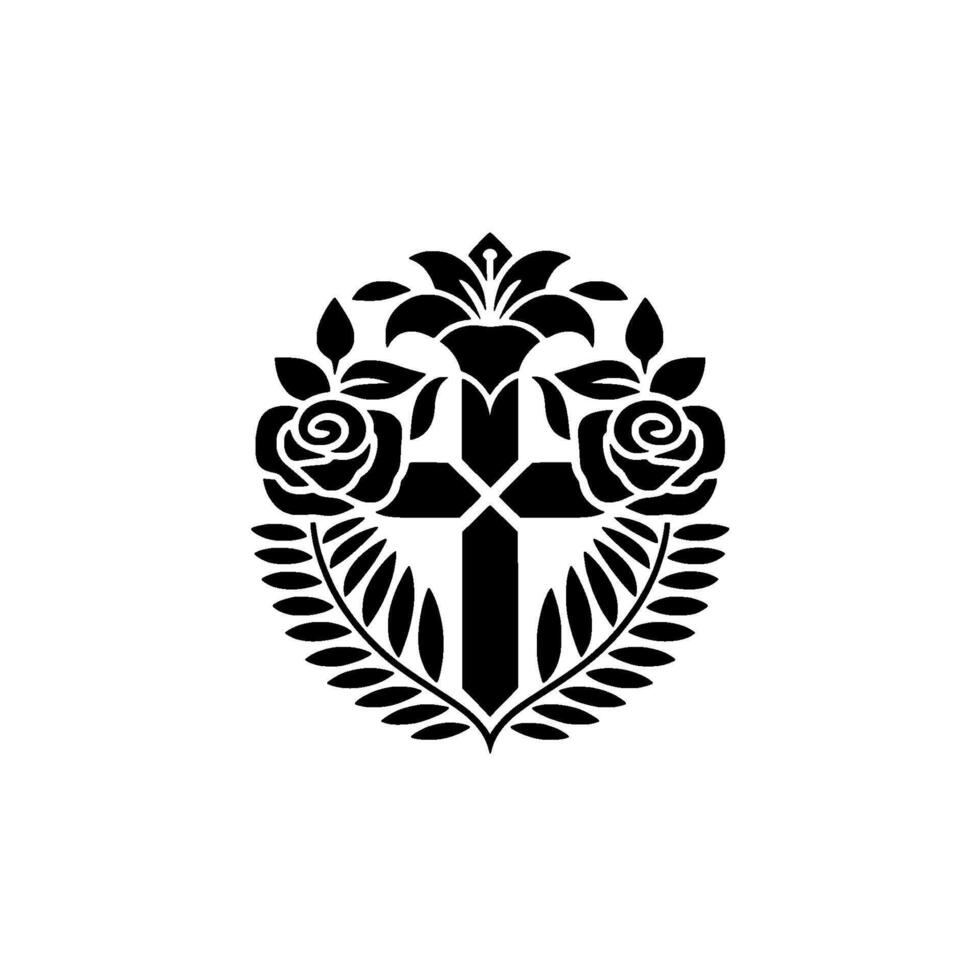 silhouette emblem featuring a Christian cross embraced by roses lilies and laurel branches set against a plain backdrop Pro Vector