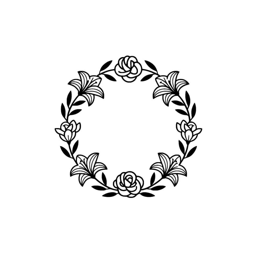 Elegant line art circular floral wreath featuring alternating lilies and roses with leaves on a plain background creating a sophisticated botanical frame Pro Vector