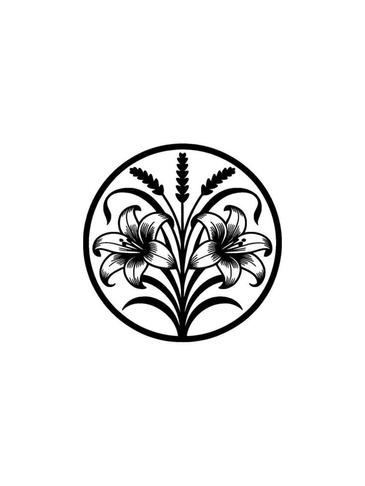 Elegant illustration of two stylized lilies with wheat stalks centered within a circular frame on a subtle textured background Pro Vector