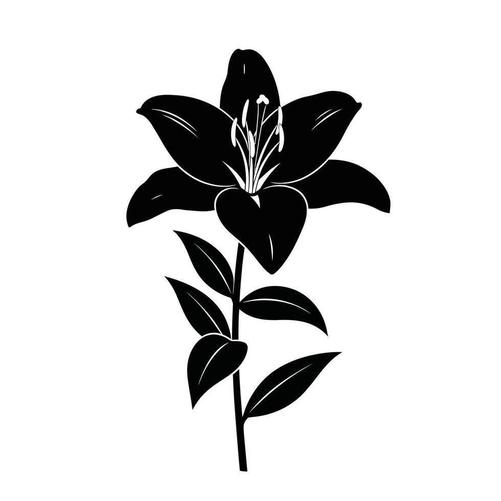 Black silhouette of a single lily flower with multiple petals and a stem with leaves on a white background Pro Vector