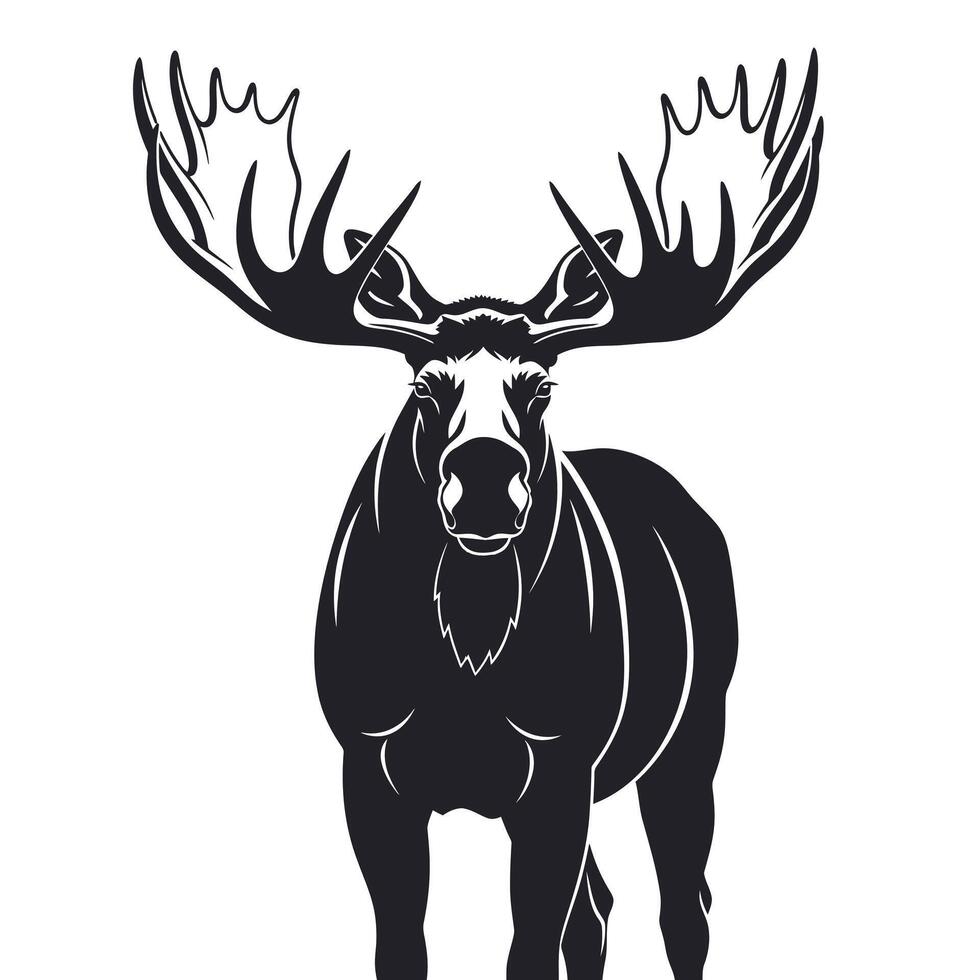 Front facing black silhouette of a large moose with wide antlers on a white background Pro Vector