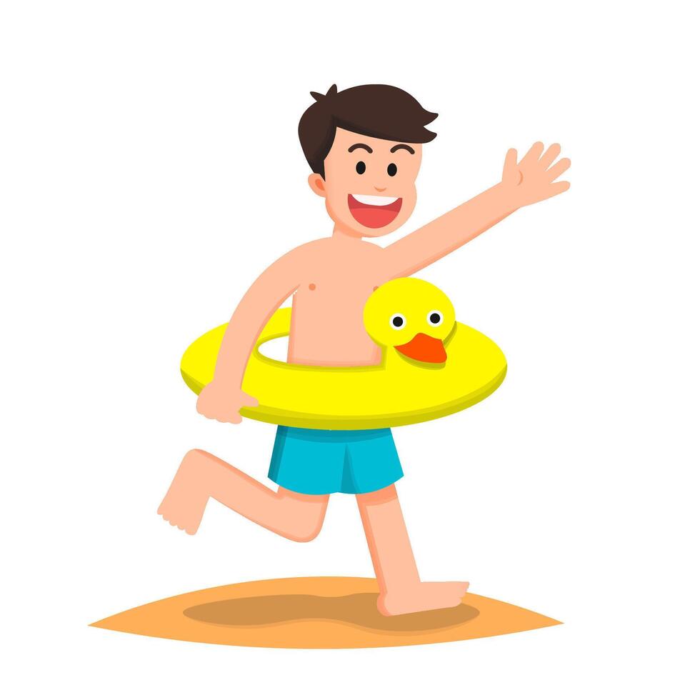 boy running on the sand while wearing an inflatable duck Pro Vector