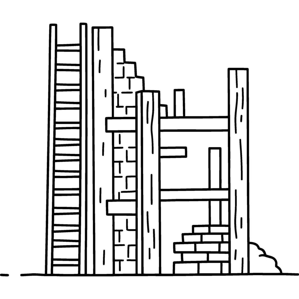 Outline of a partially constructed wooden and brick building with scaffolding and a ladder, symbolizing progress and development Free Vector