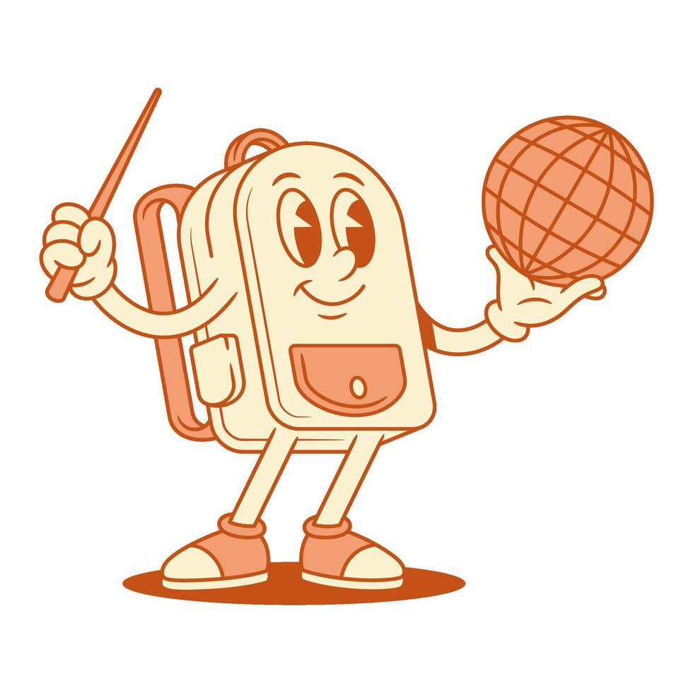 Smiling schoolbag backpack cartoon character with globe and pointer isometric Pro Vector