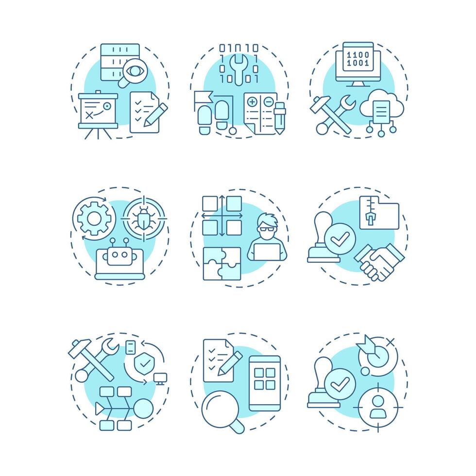 Software development and testing soft blue concept icons. Test planning, user experience. Icon pack. Round shape illustrations for infographic, presentation. Abstract idea Pro Vector