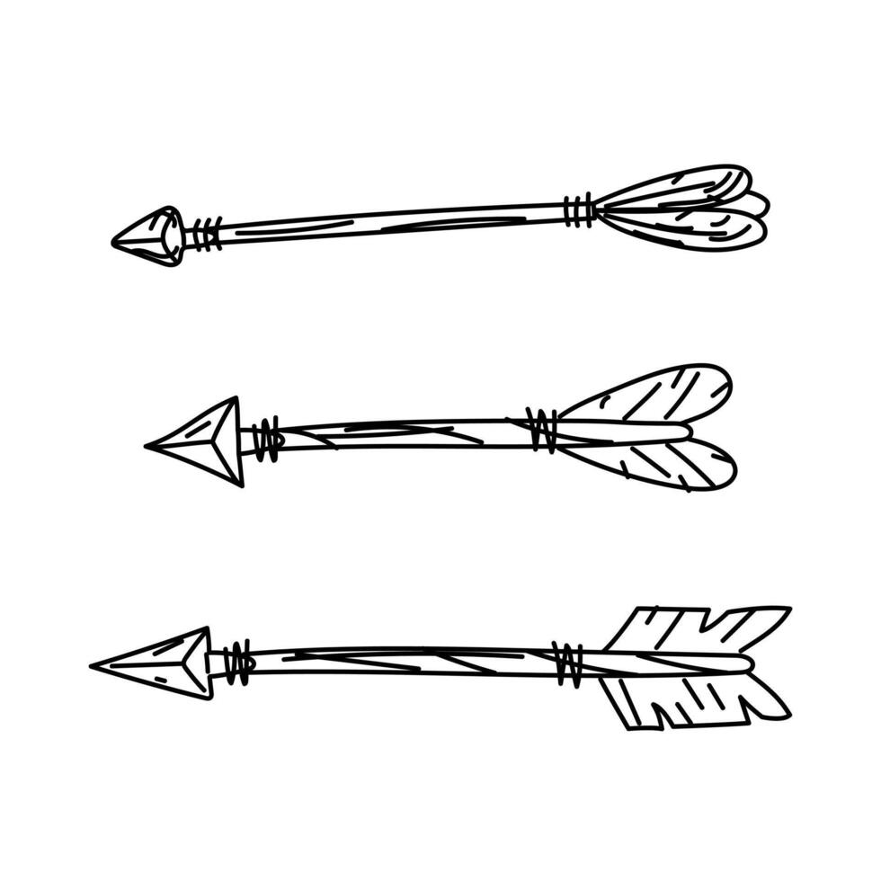 set of arrows, a Native American weapon in the style of doodles. A wooden base with a sharp tip and various feathers at the end. A handmade product. Engraving, graphics, and shading. American Indians Pro Vector
