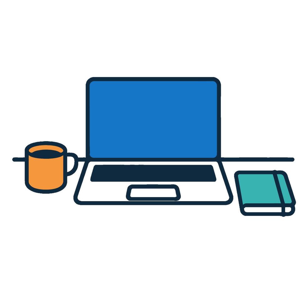 Laptop computer with coffee and notebook on a desk. Pro Vector