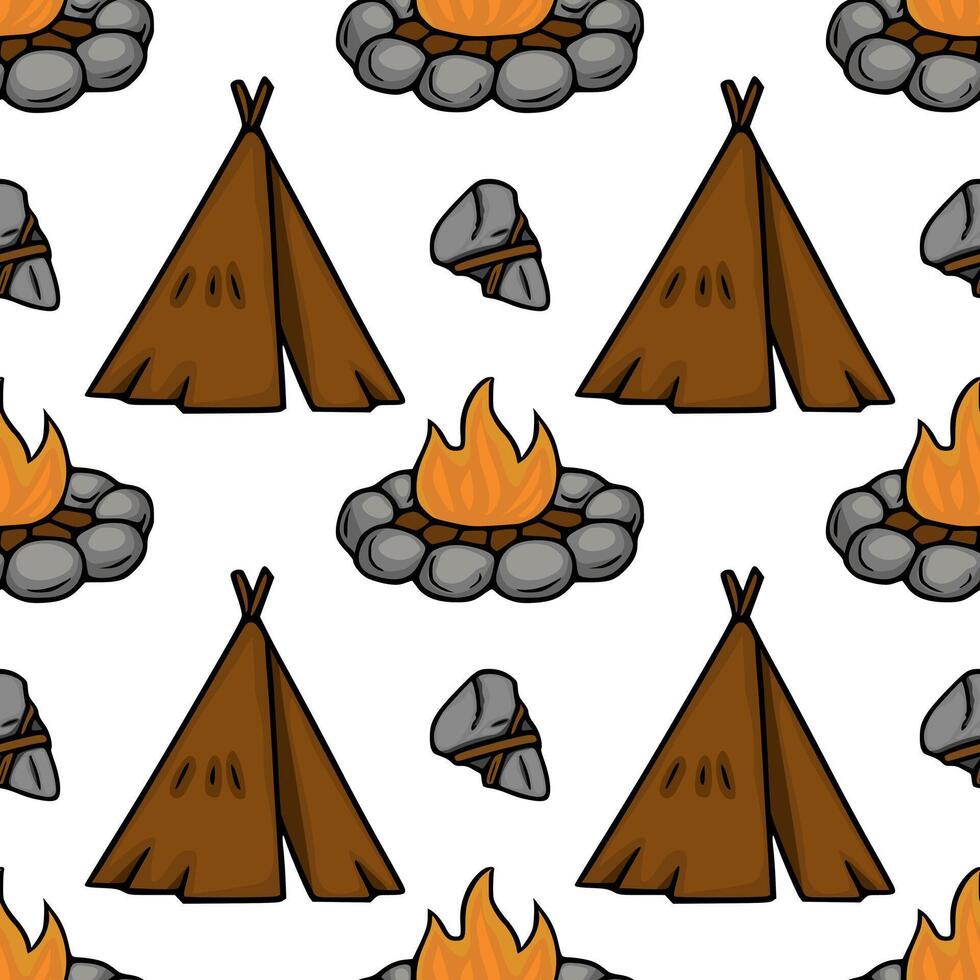 Seamless pattern featuring hand drawn illustrations of teepees, campfires encircled by stones, and primitive stone tools, creating a whimsical camping scene. Pro Vector