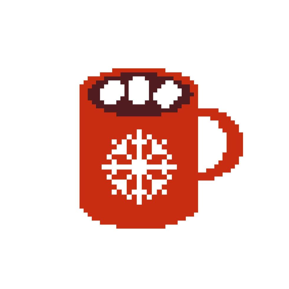 Pixel art hot chocolate with marshmallows in red mug design Retro 8bit game style Xmas icon isolated on white background Pro Vector