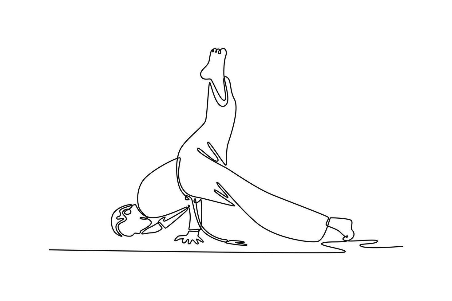 Single one line drawing man performing challenging Capoeira move, balancing on their hands with one leg extended, showcasing strength and grace. Continuous line draw design graphic illustration Pro Vector