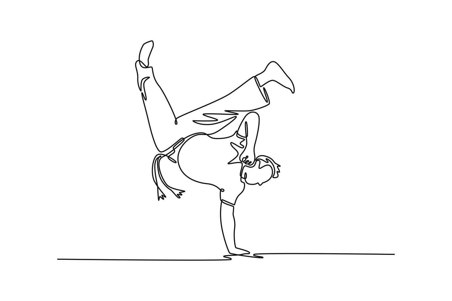 Single one line drawing man demonstrating incredible strength and balance while performing challenging, one-handed handstand, move of Capoeira. Continuous line draw design graphic illustration Pro Vector