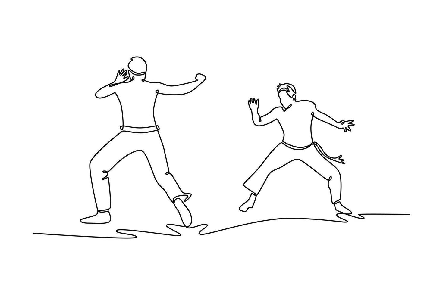 Continuous one line drawing two figures engaged in the jinga, the foundational motion of Capoeira, showcasing their readiness to move and interact. Single line draw design graphic illustration Pro Vector