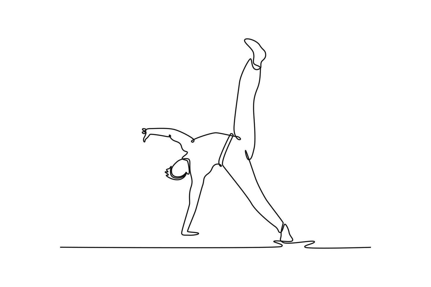 Continuous one line drawing attractive man performing an acrobatic high kick while leaning on one hand, fluid Capoeira movement, balance, and power. Single line draw design graphic illustration Pro Vector