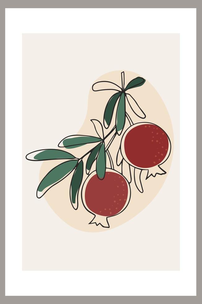 Pomegranates on a branch with leaves. Template with abstract composition, linear fruit art Pro Vector