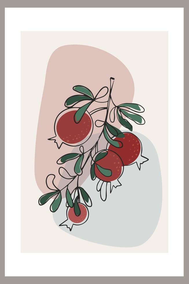 Pomegranates on a branch with leaves. Template with abstract composition, linear fruit art Pro Vector