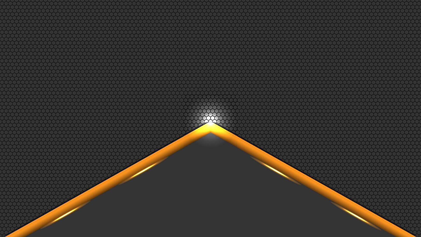 Abstract glowing golden triangle with light effect on a dark hexagonal textured background Pro Vector
