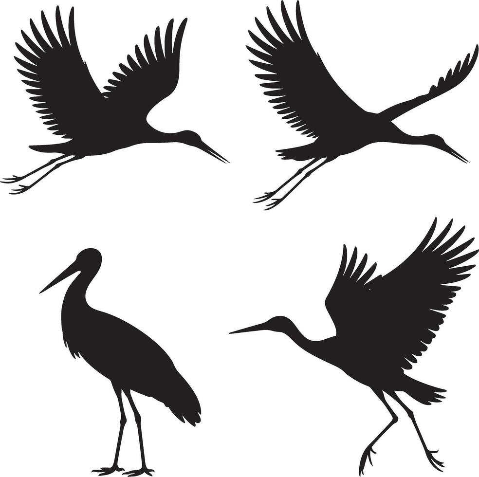 Dynamic Silhouette Depiction of Cranes in Various Flying Poses on a Plain Background vector