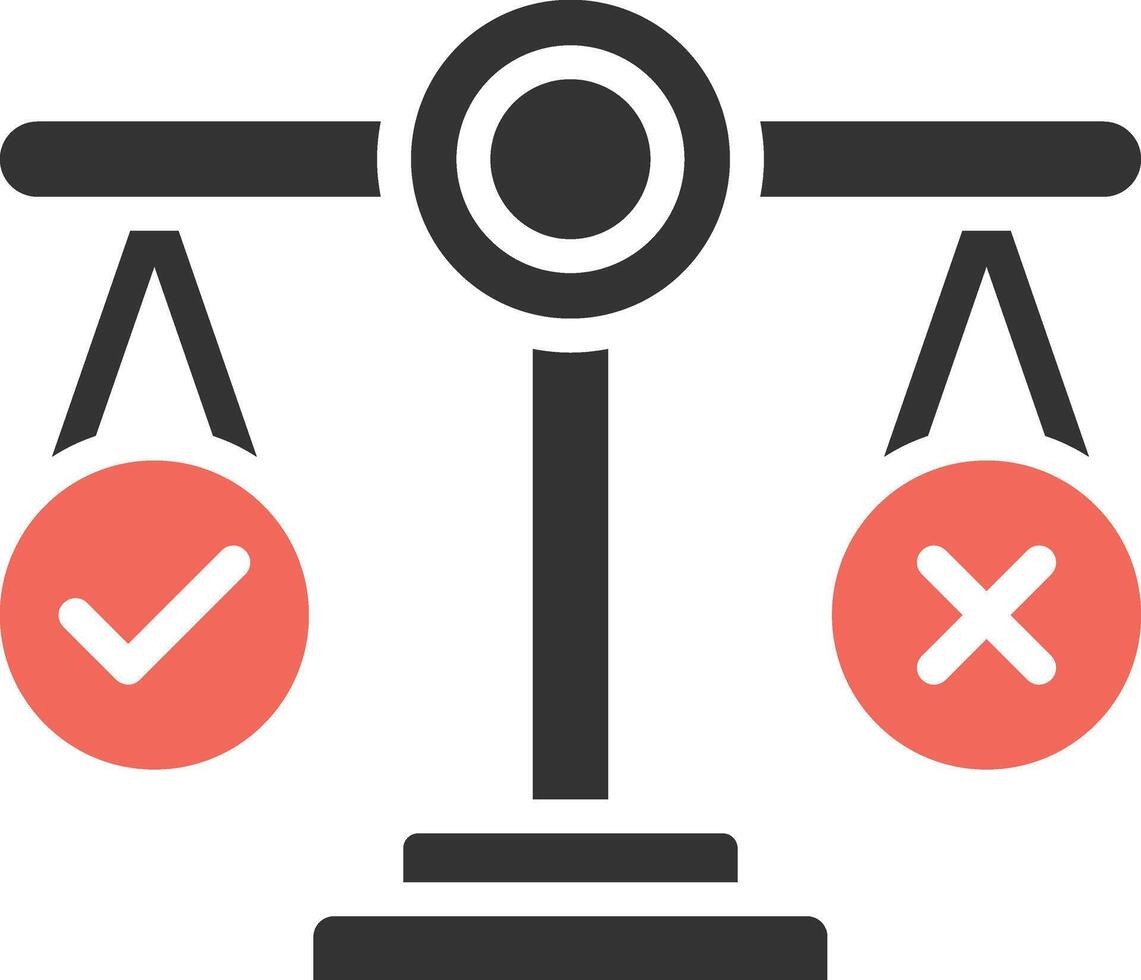 An icon symbolizing justice, balance, decision, or comparison between right and wrong to reach a verdict of guilty or not guilty. Pro Vector
