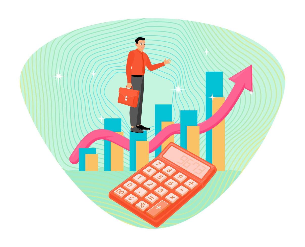 Calculate revenue growth. Man Standing on Bar Graph With Rising Arrow, Calculator, and Briefcase. Pro Vector