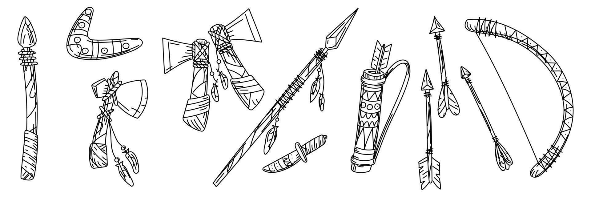 set of elements in style of scribbles, Native American weapons. Spears, bow and arrows, tomahawk, axe, boomerang made of wood with feathers. Handmade items. Black, white scribbles. American Indians Pro Vector