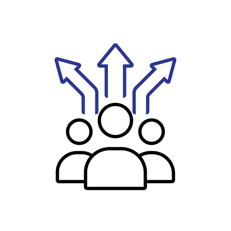 Decision icon. Management. Three people with three arrows pointing in different directions. manager, success. outline design style. Pro Vector