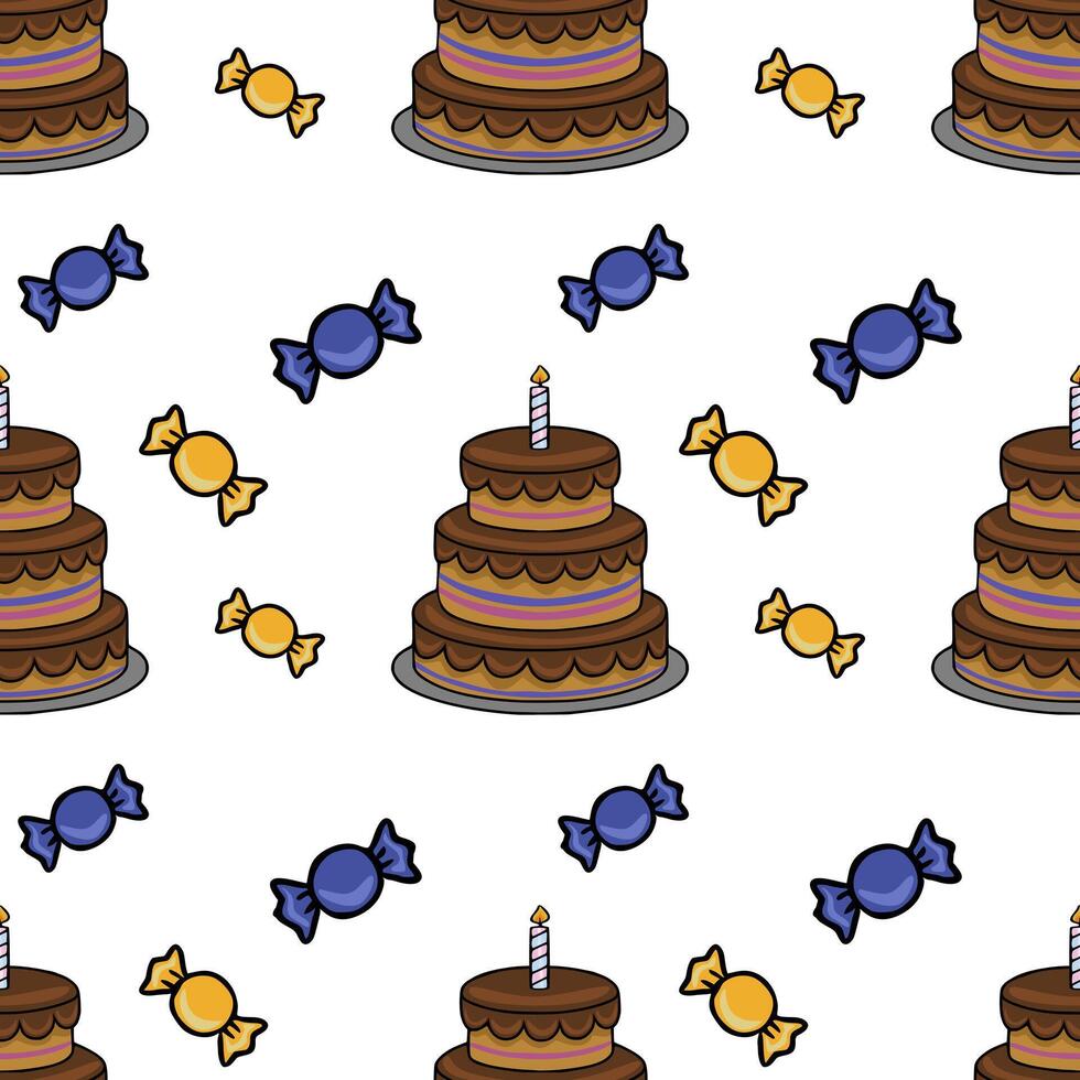 Seamless pattern featuring a delightful two-tiered chocolate birthday cake with a single candle and scattered blue and orange candies, creating a festive and cheerful design. Pro Vector
