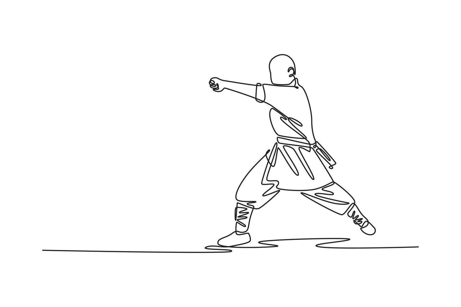 Single continuous line drawing man middle of powerful punch, his body in a low, stable stance, focused energy and strength of Shaolin Kung Fu. Dynamic one line draw graphic design illustration Pro Vector