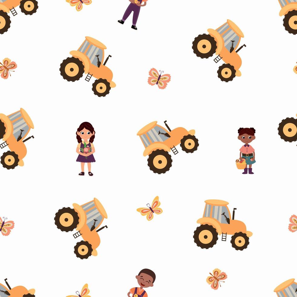Seamless pattern farm. Pattern with Tractors and Children. Endless patterns for your design Pro Vector