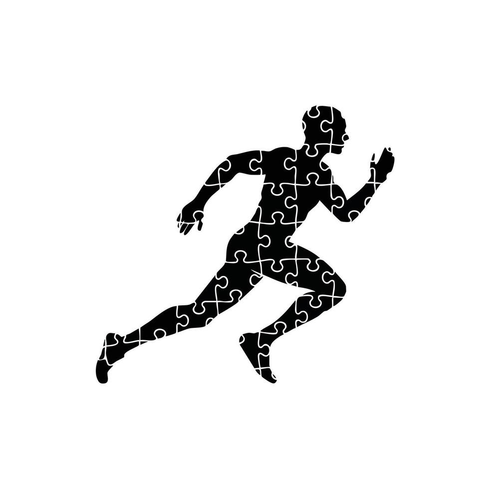 Dynamic silhouette of a runner composed of puzzle pieces, symbolizing the complexity of athleticism and movement. Pro Vector