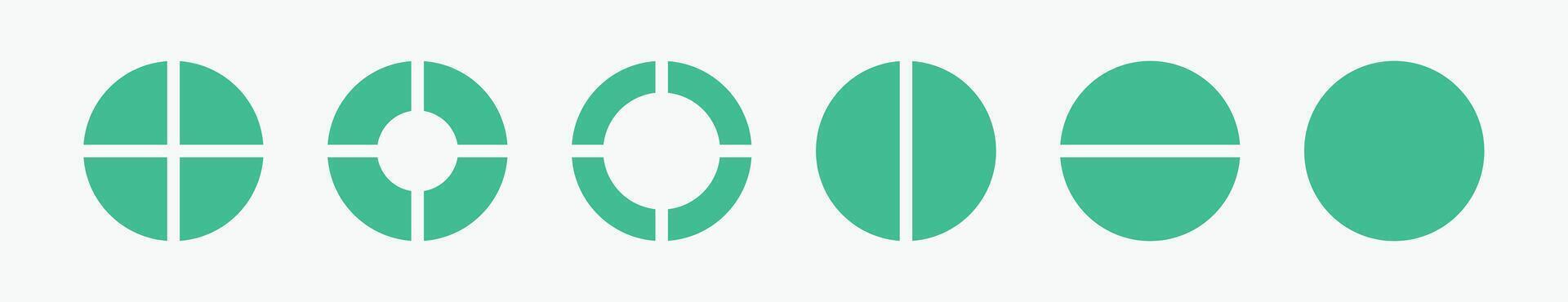 Set of four parts of circle. Pie chart with four same size sectors. A series of six green circle graphics are displayed in a row. Pro Vector