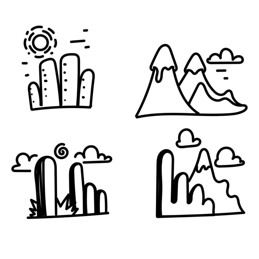 four different hand drawn icons of mountains, trees and clouds Pro Vector