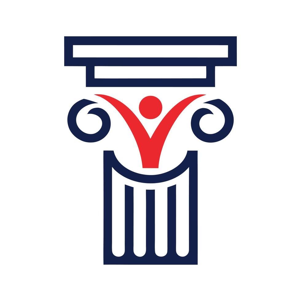 Red human figure with arms raised on blue column with scrolls pillar architecture Pro Vector
