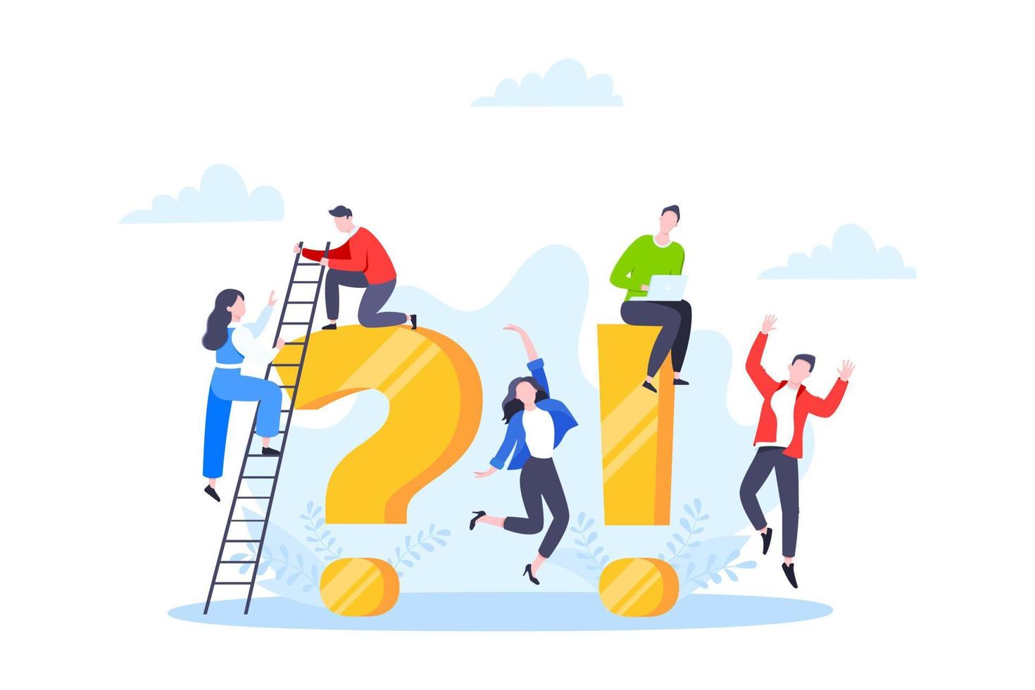 Q and A or FAQ concept with tiny people characters, big question and exclamation mark. Pro Vector
