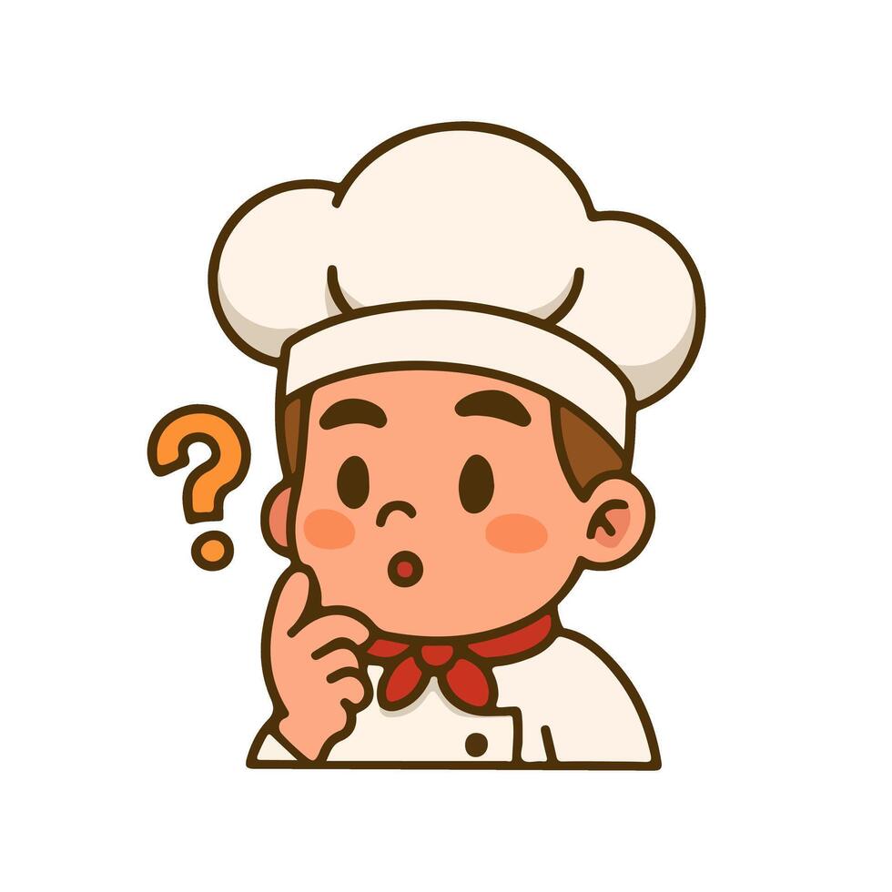 Cute chef cartoon character confused with question mark. Kawaii cook illustration in uniform showing puzzled expression. Adorable chef emoticon asking question with doubt face. Pro Vector