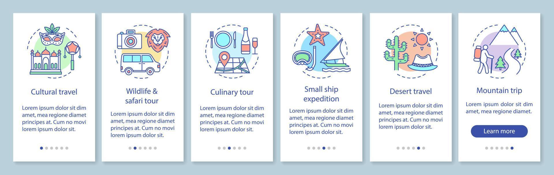 Travel experiences onboarding mobile app page screen with linear concepts. Cultural and desert travel. Six walkthrough steps graphic instructions. UX, UI, GUI vector template with illustrations Pro Vector