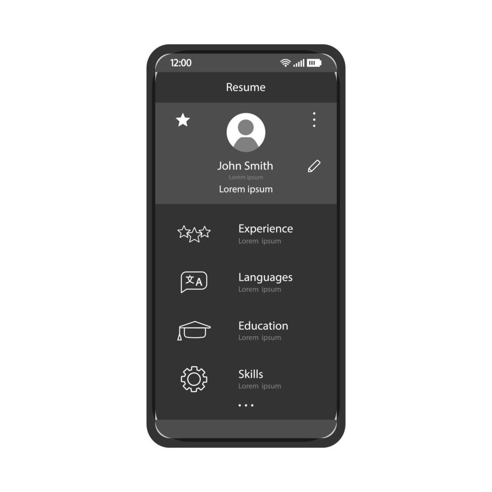 CV smartphone app interface vector template. Mobile job search application interface black design layout. Resume builder screen. Flat UI. Phone display with personal information Pro Vector