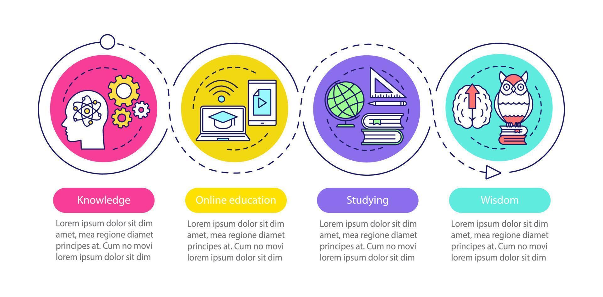 Education vector infographic template. Knowledge, online education, studying, wisdom. Data visualization with four steps and options. Process timeline chart. Workflow layout with icons Pro Vector