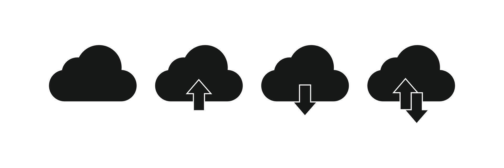 Digital storage set featuring cloud upload, download, and sync icons in black. Ideal for web and mobile app UI UX, data transfer, and server technology designs Pro Vector