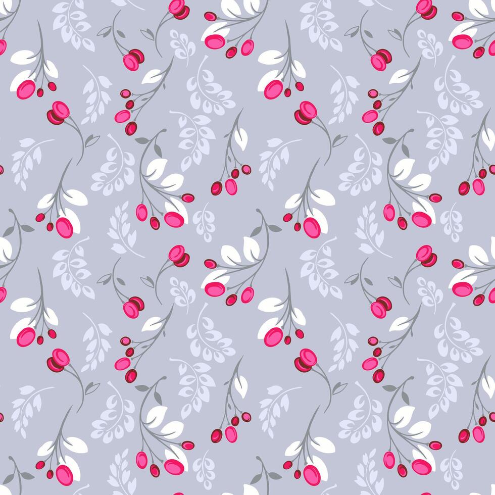 Seamless pattern with decorative branches of red berries and white leaves on soft grey background. Elegant botanical design for textiles, wallpapers, wrapping and stationery Pro Vector