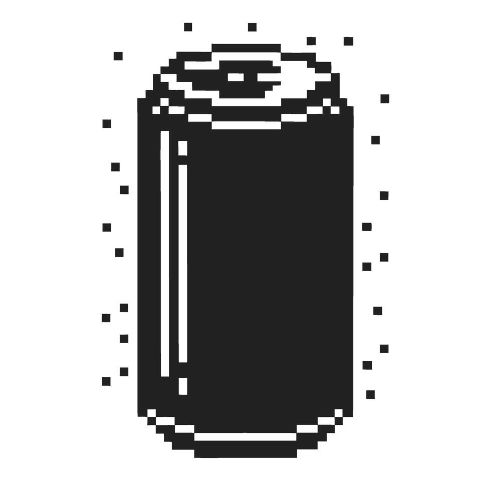 Retro pixel art soda can with fizzy bubbles, black and white digital beverage icon in nostalgic 8 bit Pro Vector