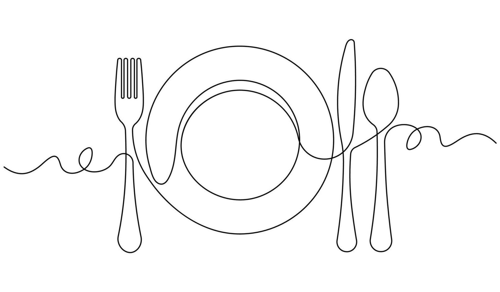 One Line Art Dining Set - Minimalist Continuous Line Drawing of Plate, Fork, and Spoon Pro Vector