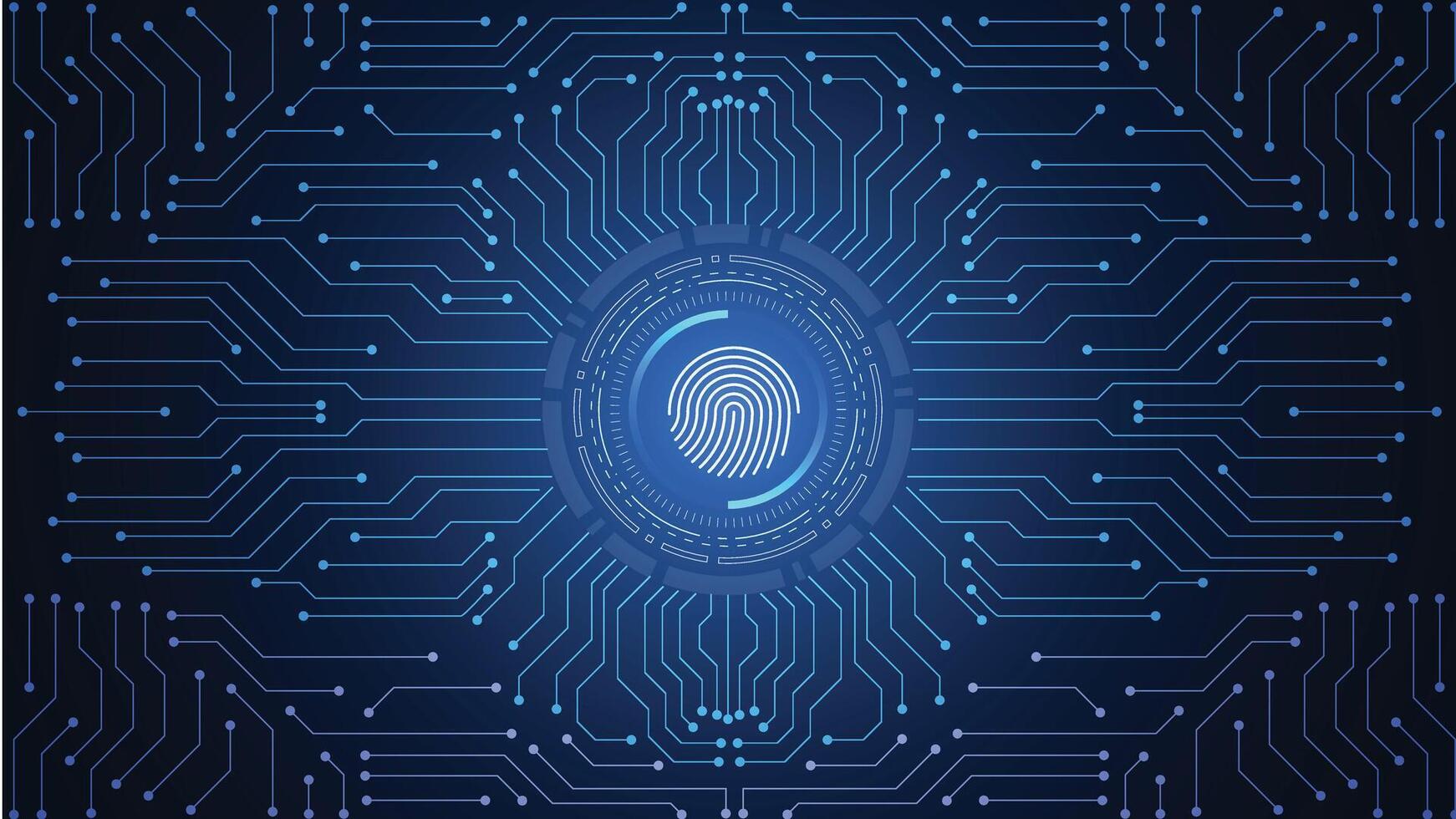 Futuristic technology background with fingerprint scanner and glowing blue digital circuit lines, perfect for cybersecurity, biometric, and high tech concepts Pro Vector