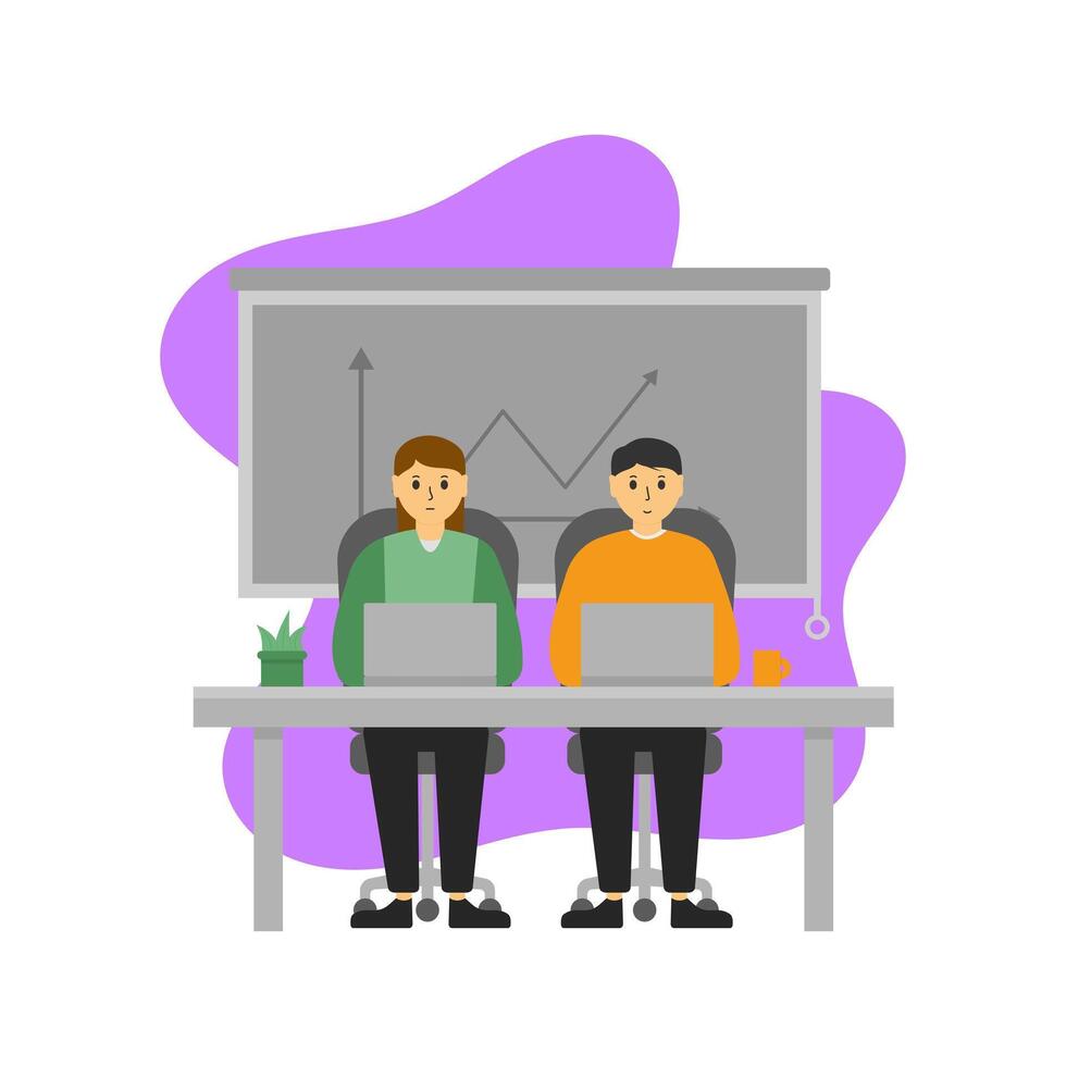 Flat Illustration of Two Office Workers Working with Laptops, Presentation Boards, and Charts. Suitable for Teamwork, Business, dan Office Pro Vector