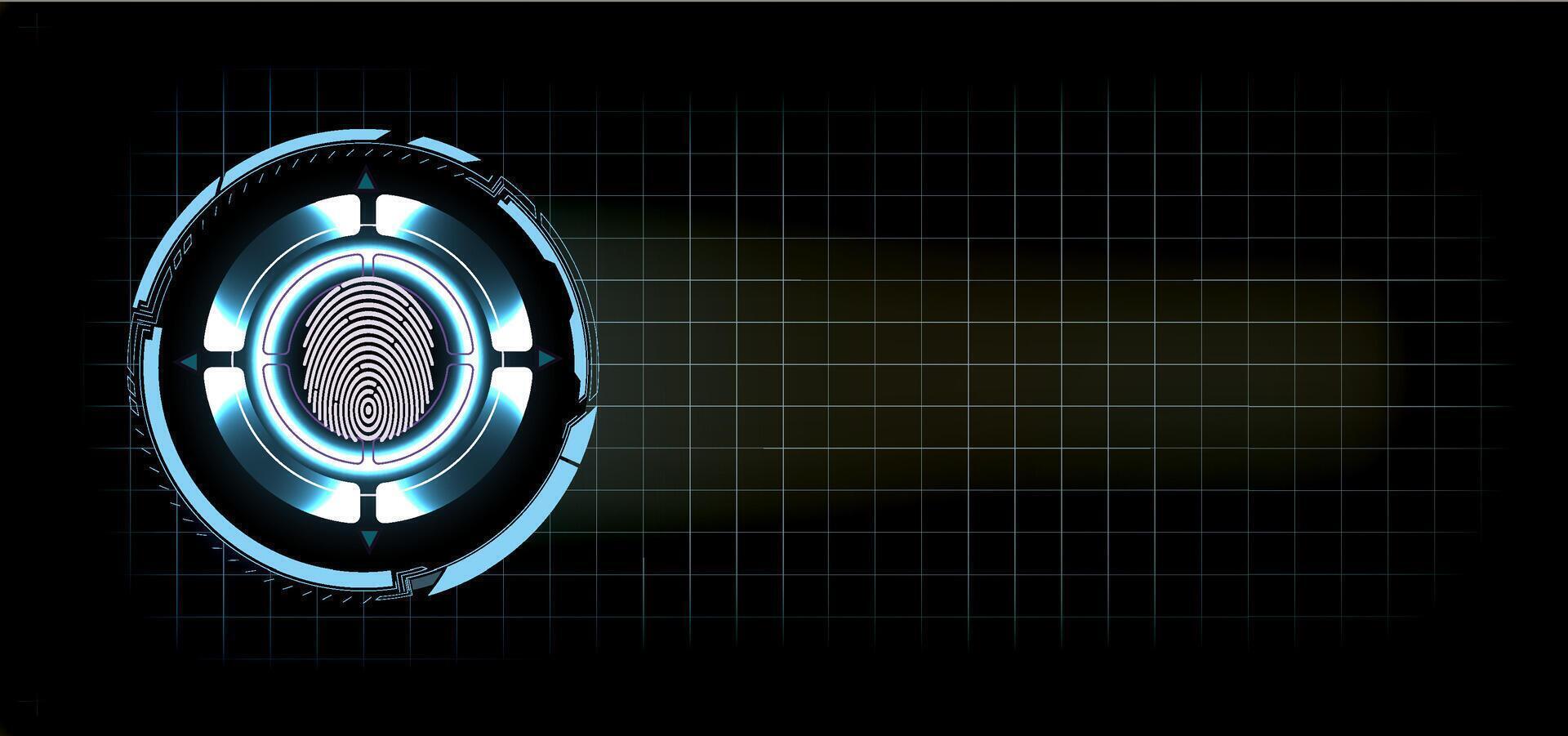 This digital design showcases a futuristic biometric security system with a glowing fingerprint scanner. The high-tech scanner stands out against a dark background, emphasizing innovation. Pro Vector