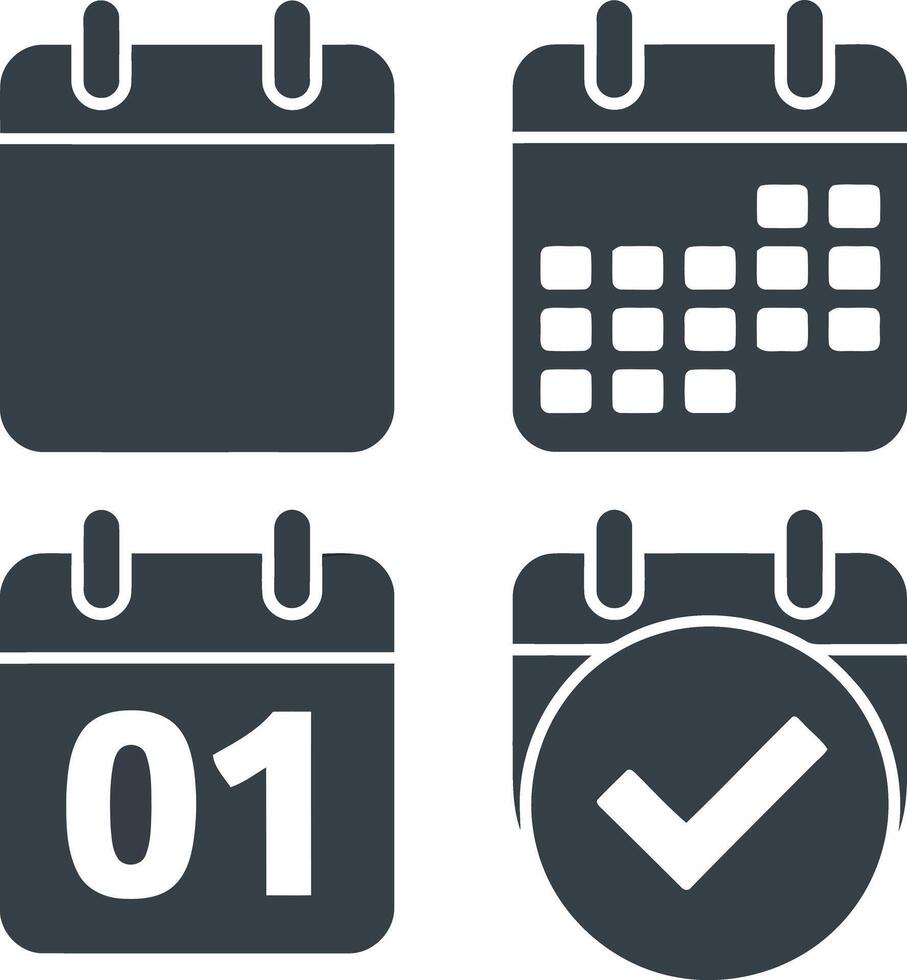 Four dark gray calendar icons showing different views blank, grid, date 01, and checked date illustration Pro Vector